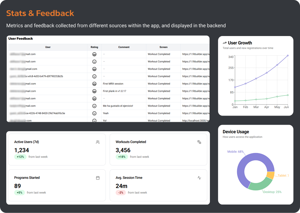 - To monitor metrics, different sources exist in the app and externally: the custom-made analytics dashboard in the admin backend, Microsoft Clarity, Google Analytics, and Google Play Console.