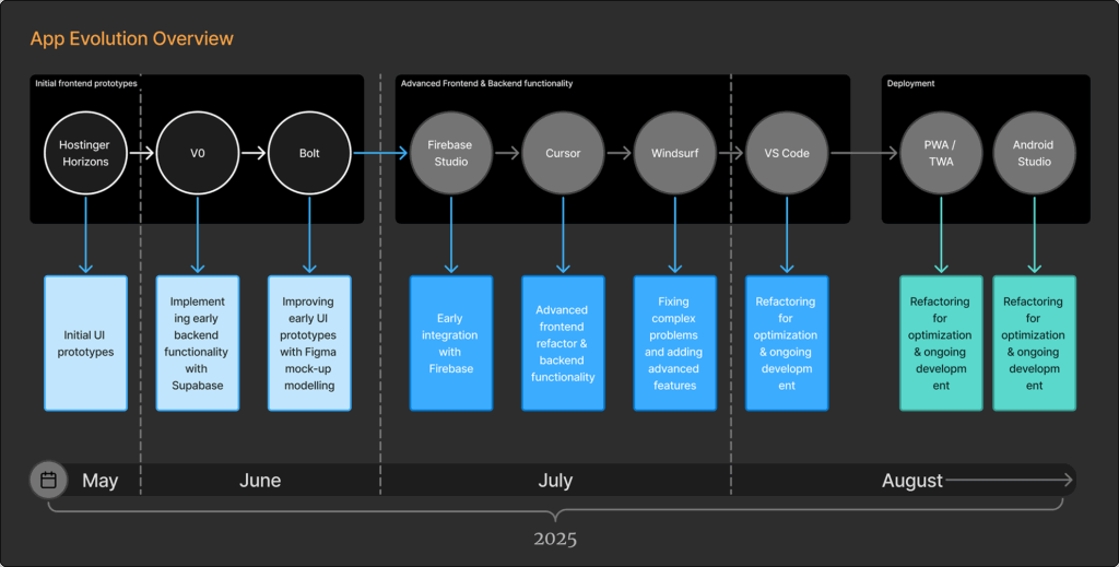 My approach was to use the latest coding tools available, at that time, with agentic AI features to accelerate development and explore different implementation methods. Since the project was not bound to any particular technologies at the beginning, I had freedom to choose any combination of suitable solutions. This resulted in frequent tool-switching, and I evaluated each for strengths and limitations as the app’s complexity increased over time.